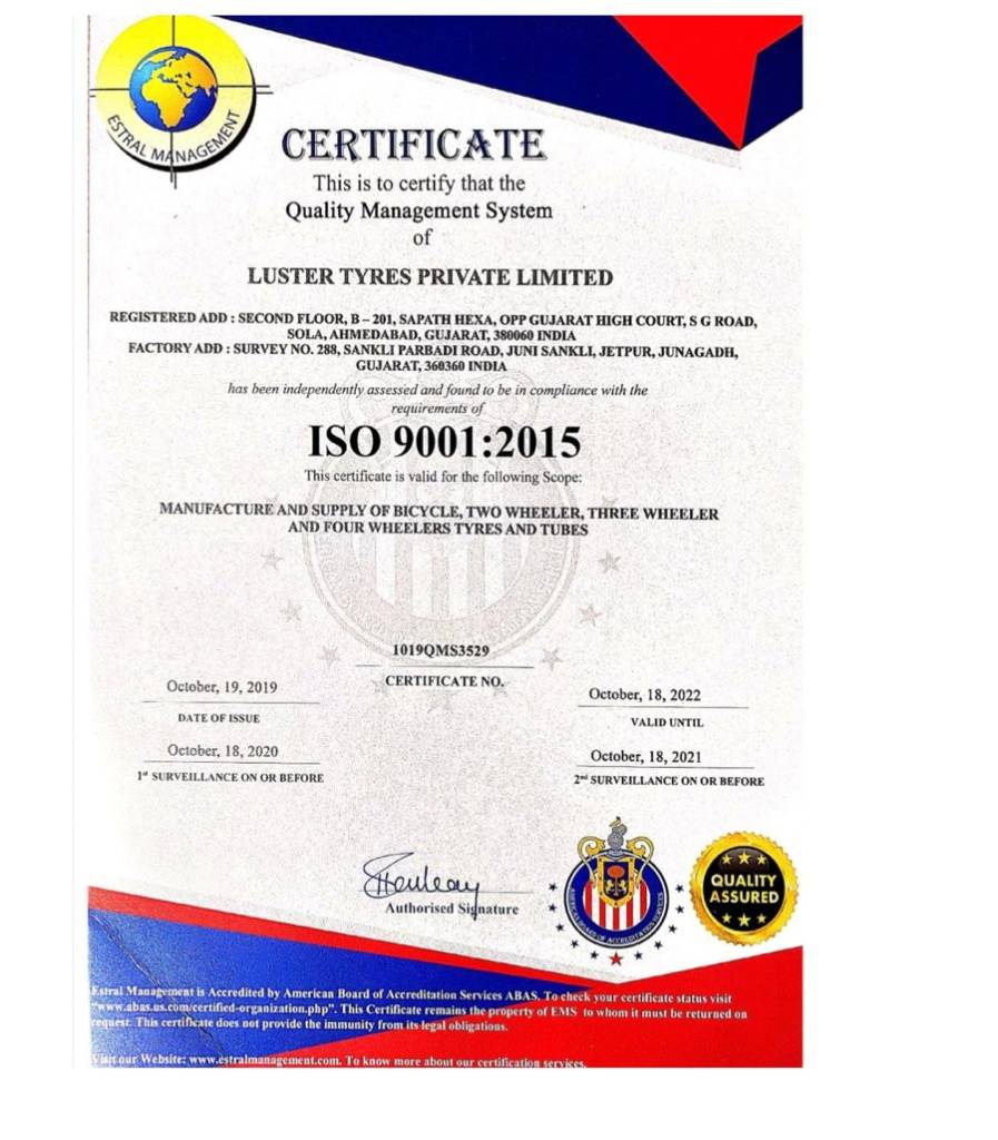 Luster tyres Private Limited is a trusted name in the tyre and tube manufacturing industry. The company is the champion manufacturer and supplier of a wide range of dimensionally perfect Tyres, Cycle Tyre, Rickshaw Tyre, Bicycle Tube, Auto Tube. ,Auto rickshaw tube,car radial tube,L.C.V tube,Truck/bus radial tube and tractor tube. We are supported by a team of diligent professionals, which makes full use of available resources to manufacture a quality range of safety matches. Further, we also conduct regular training sessions for our professionals to strengthen their abilities and skill. ISO 9001:2015 Certified, Luster tyres is among the prominent Bicycle tyre and tube Suppliers. We have been serving in the industry since our inception in 2011. We facilitate our global clientele from our base in Rajkot, Gujarat.